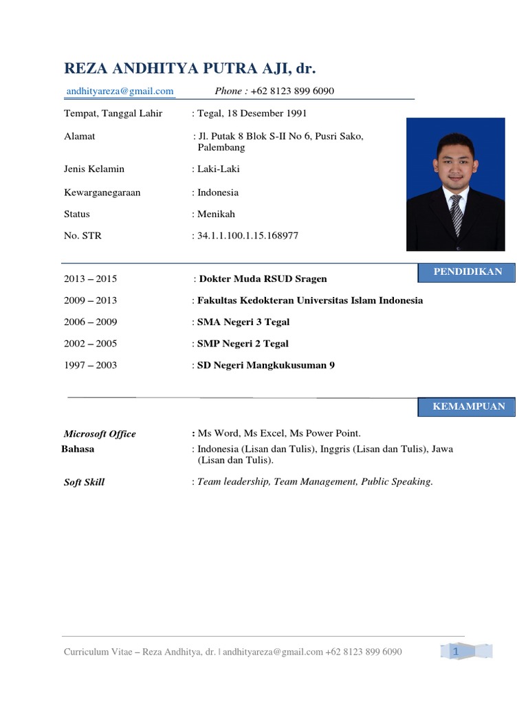 Contoh cv curriculum vitae (resume) untuk lamaran kerja atau profesional, menggunakan bahasa indonesia dengan desain yang menarik. Contoh cv dokter umum fresh graduate archives gawe cv. Berikut ini adalah contoh curriculum vitae secara umum dan paling sederhana yang banyak digunakan oleh fresh graduate atau yang belum pernah bekerja Pada bagian pengisian kolom keahlian, jangan lupa sertakan keahlian yang membedakanmu. Anda dapat melihat dengan jelas contoh curriculum vitae dokter umum menggunakan desktop anda, tablet, android atau iphone. Saya bermaksud mengajukan lamaran kerja di pt dokter moez indonesia yang bapakibu pimpin untuk menempati posisi sebagai dokter umum. Berisi informasi mengenai diri anda atau bio, riwayat pendidikan, riwayat pekerjaan hingga riwayat prestasi anda. Anda dapat menyesuaikan dan mengembangkan sesuai dengan jenis misalnya, anda mau mengajukan lamaran sebagai dokter (doctor), bidan (midwife), perawat (nurse), asisten. Cv data diri pengalaman kerja alamat: Contoh cv terbaru untuk melamar pekerjaan baik untuk fresh graduate maupun pekerja berpengalaman. Curriculum vitae yang sering disingkat jadi cv atau dalam bahasa indonesia dikenal dengan istilah daftar riwayat hidup, pada umumnya digunakan untuk melamar pekerjaan atau untuk promosi jabatan. Kumpulan contoh contoh surat lamaran kerja umum format doc. Saya juga dapat bekerja keras jujur rajin dan mampu bekerja secara mandiri maupun tim.