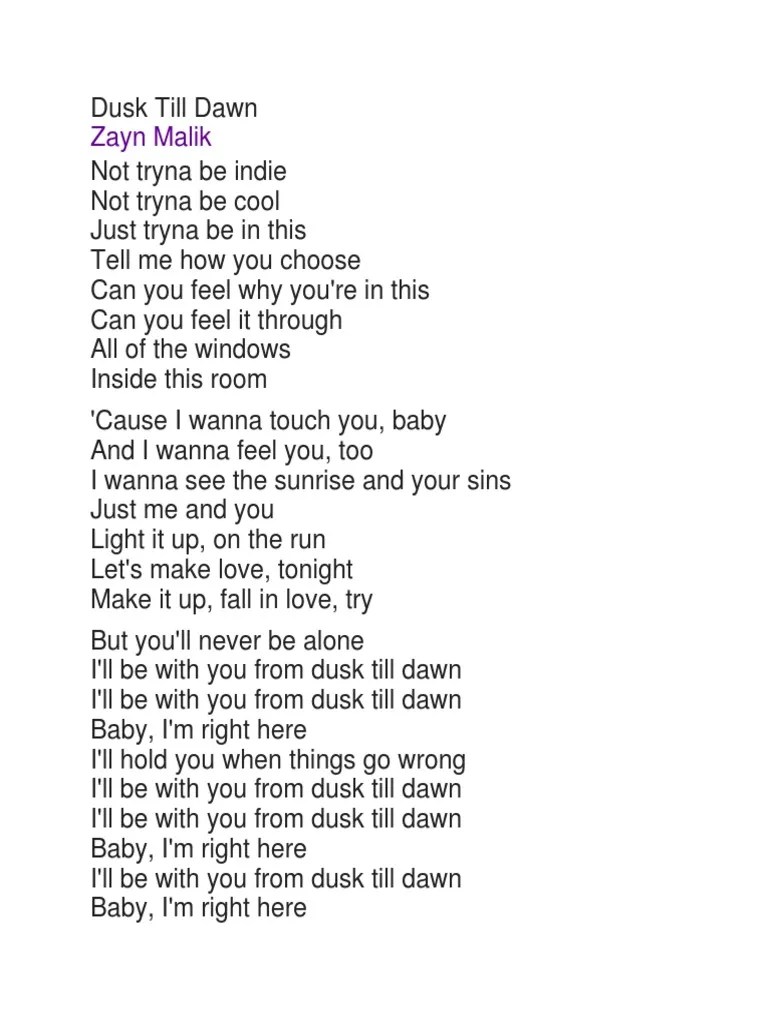 C just tryna be in this verse 1 am7 not tryna be indie. Lirik lagu dusk till dawn dari zayn feat sia. Lagu tersebut diunggah di akun youtube zayn pada 7 september 2017 lalu. Dusk till dawn is a pop power ballad.